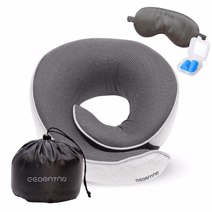 Perna de Calatorie pentru Gat, Cadou 3 accesorii, Sac de transport impermeabil, Dopuri de urechi, Masca de dormit 3D, utila in Avion si Masina, din Spuma cu memorie, Husa respirabila, Alunga durerea cervicala, Marime ajustabila, Roz