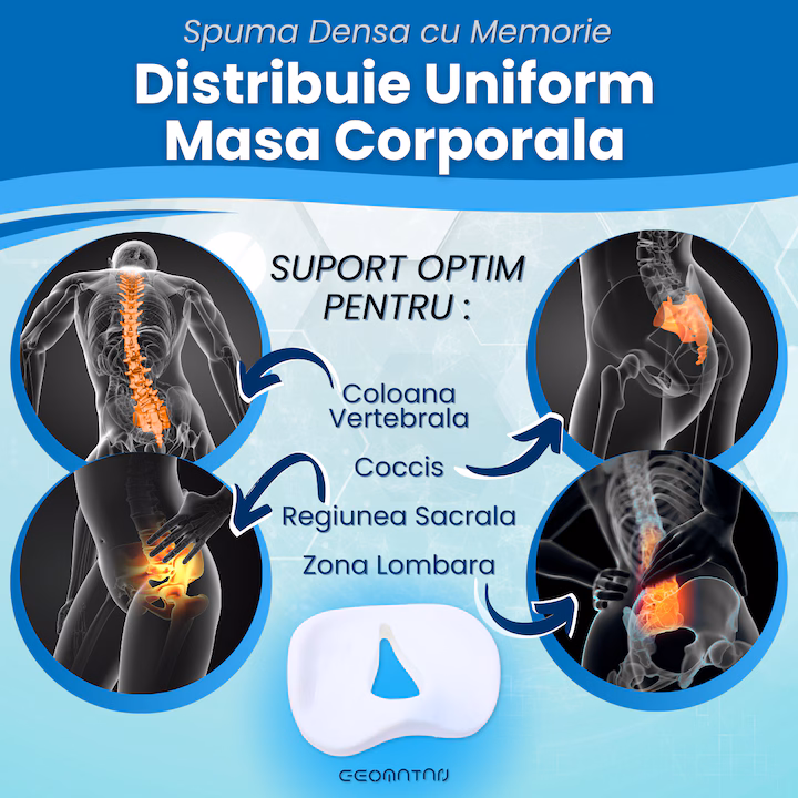 Perna ortopedica GEOMATAN® cu spuma de memorie PREMIUM pentru scaunul de acasa, birou sau masina este solutia ideala pentru tine daca: