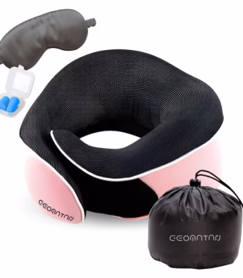 Perna de Calatorie pentru Gat, Cadou 3 accesorii, Sac de transport impermeabil, Dopuri de urechi, Masca de dormit 3D, utila in Avion si Masina, din Spuma cu memorie, Husa respirabila, Alunga durerea cervicala, Marime ajustabila, Roz